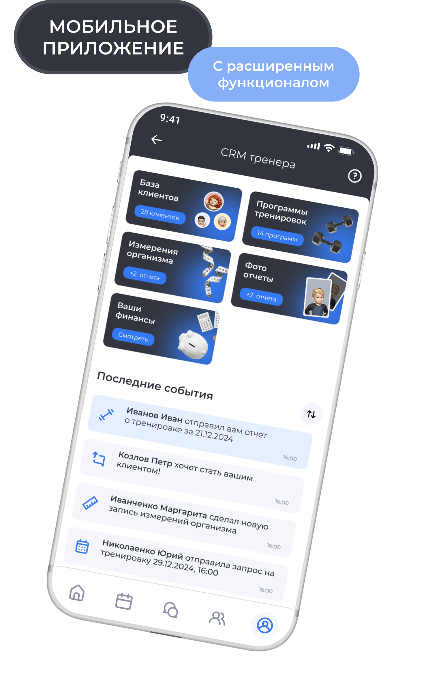 А также полноценная CRM для тренера, которая позволяет вести под ключ своих подопечных